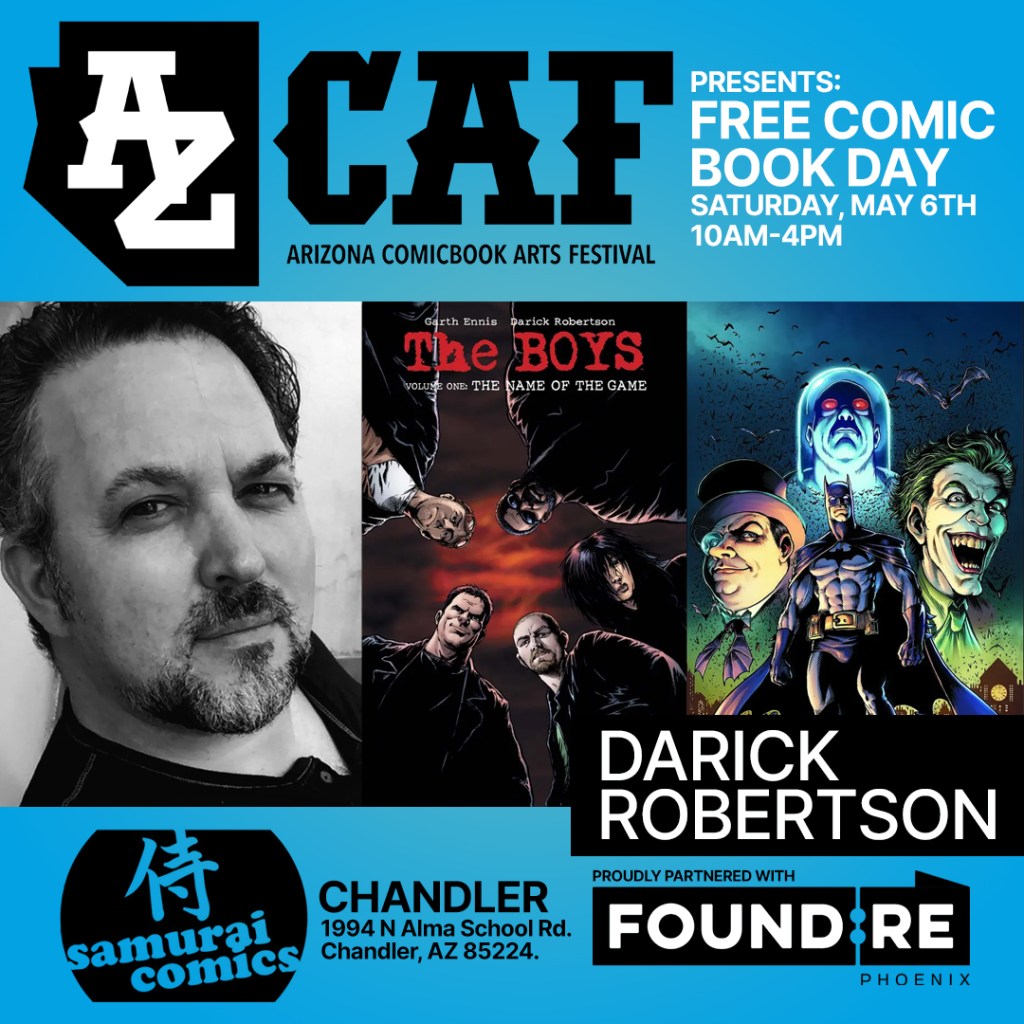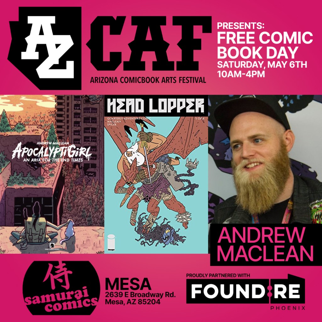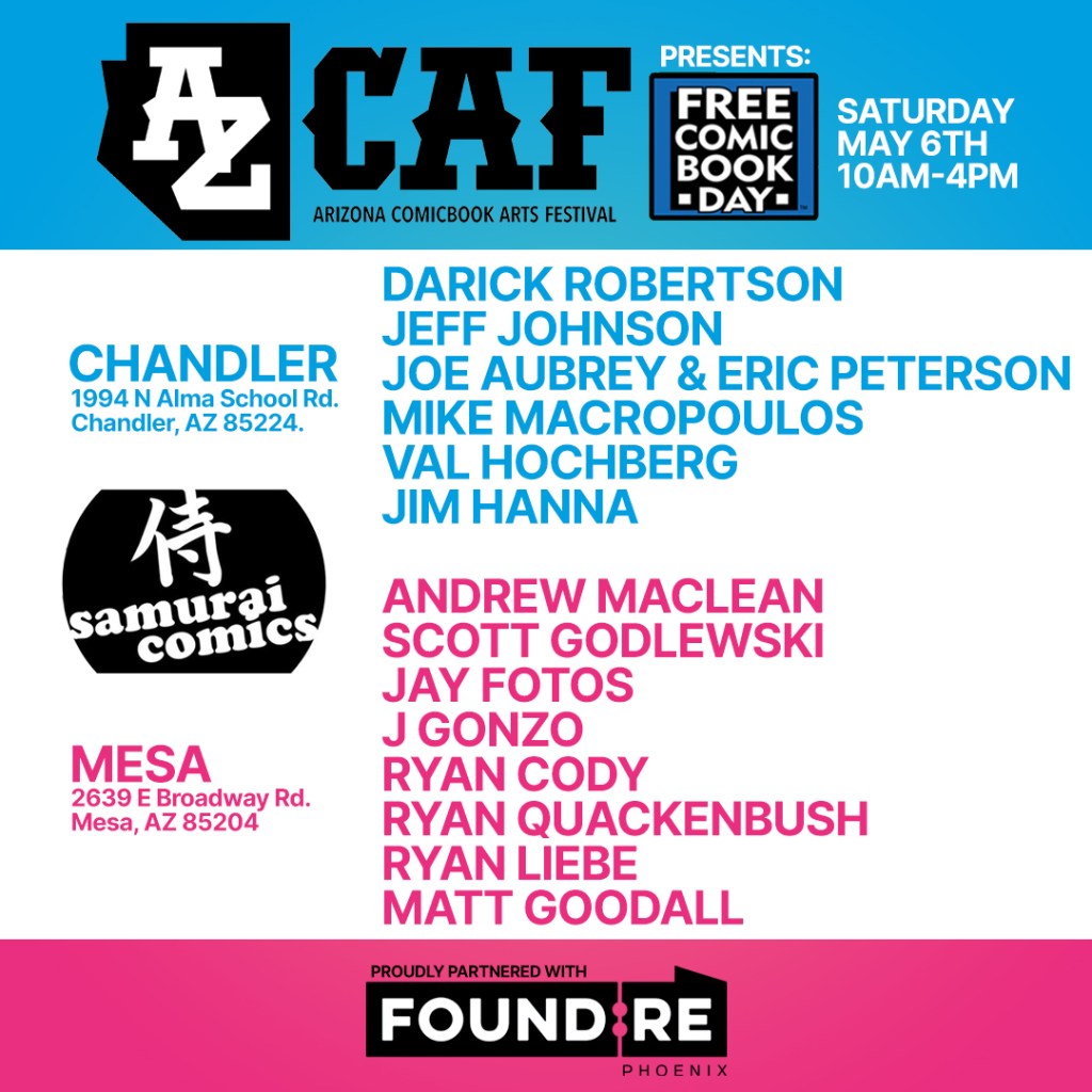 This year we’re teaming up with Samurai Comics in Mesa and Chandler to celebrate Free Comic Book Day on May 6th. We’ll have 12 local creators alongside 3 national guests so be sure to visit both locations!